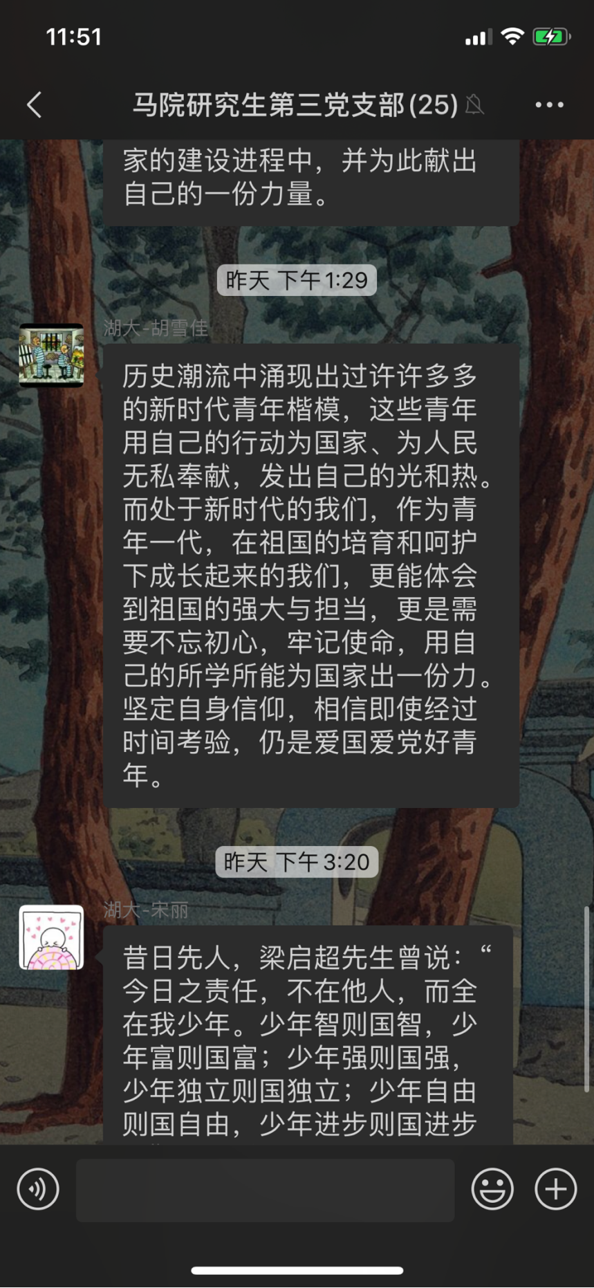 研究生第三党支部组织观看由共青团中央举办的“让青春为祖国绽放”网上主题团日活动。在观看直播的过程中,支部党员真学习视频所讲内容,对五四精神有了更深层次的感悟。