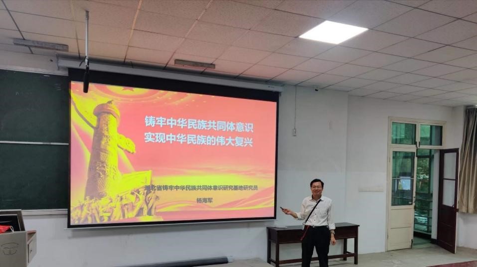 授课过程中,杨海军给同学们详细介绍了中央民族工作会议精神、在党的坚强领导下我国民族工作取得的辉煌成就、高校做好“铸牢中华民族共同体意识”相关工作的要求,并引导同学们学习领悟我国民族工作实践中的历史智慧。他勉励同学们,作为新时代的大学生,应自觉学习马克思主义民族观和习近平总书记在中央民族工作会议上的讲话精神,铸牢中华民族共同体意识,维护民族团结,为实现中华民族伟大复兴的中国梦奉献青年力量。