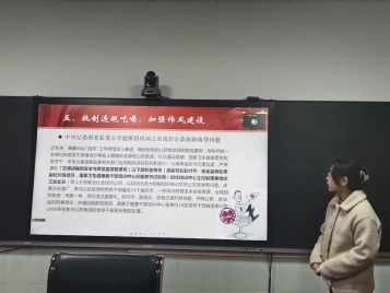会议开始,在完成入党宣誓、学习党章、交纳党费之后,马艳苹同志领学了中国式现代化的特色和本质要求。随后以通报的违规吃喝典型案例为切入点,开展了党风廉政建设专题教育活动,她强调,大学生党员是国家未来的骨干力量,必须牢固树立廉洁思想,坚持党员本色,保持党员初心。