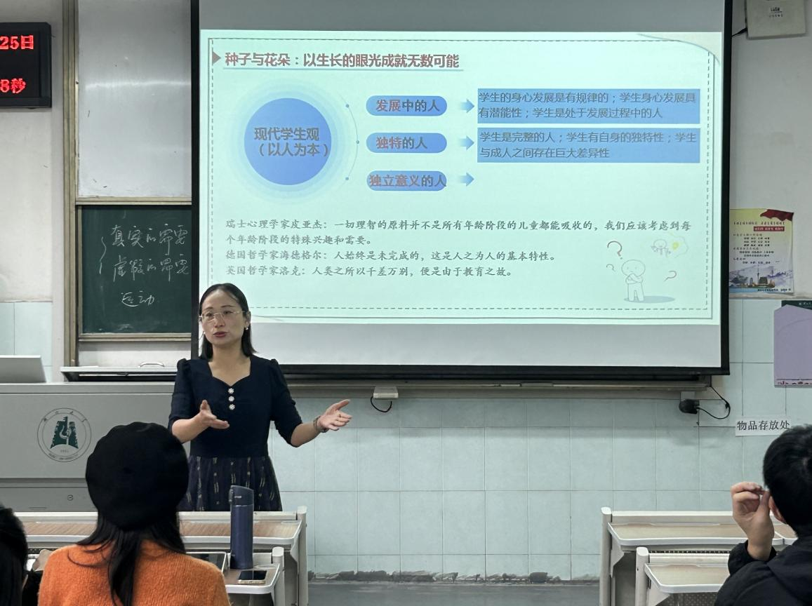 陈丽老师从“享受教师的尊严和幸福”“扎扎实实立足课堂”两个方面展开此次讲座。讲座上,她利用教育家精神的价值内涵向同学们讲述了教师的责任与使命,引导同学们树立正确的教师观;利用教学一线情境化教学的优秀范例向同学们展示了上好一堂思政课所要注意的细节,引导同学们树立良好的教学观。此外,陈丽老师特别强调了教师群体思想的重要性,她结合法国著名思想家帕斯卡《思想录》当中的内容,对在场同学提出忠告,作为一名优秀的高中政治老师除了向学生传授知识外,还要做好学生的思想引领工作。