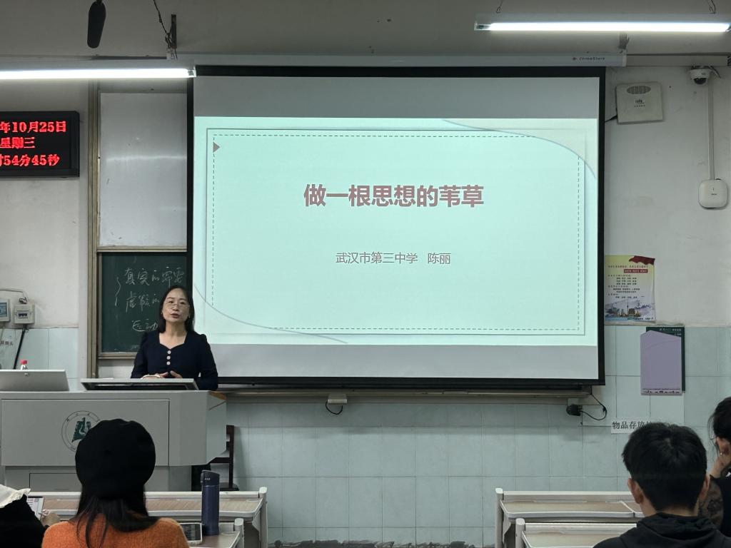 10月25日上午,武汉市第三中学思想政治课优秀教师陈丽老师应邀为为麻豆做爱2022级学科教学(思政)研究生作题为“做一根思想的苇草”的专题讲座,给即将步入教师岗位的同学们传授实际教学经验。22级学科思政研究生全体同学参加此次讲座。讲座由程亚勤老师主持。