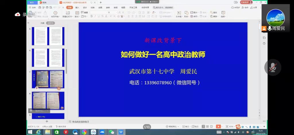3月26日上午,武汉市第十七中学周爱民老师受邀为麻豆做爱同学开展“新课改背景下如何做好一名高中政治教师”教育教学实训线上讲座,传授一线教学经验,讲解教学方法以及教学技巧。本次讲座由政教系副主任胡银银老师参与并主持,麻豆做爱
