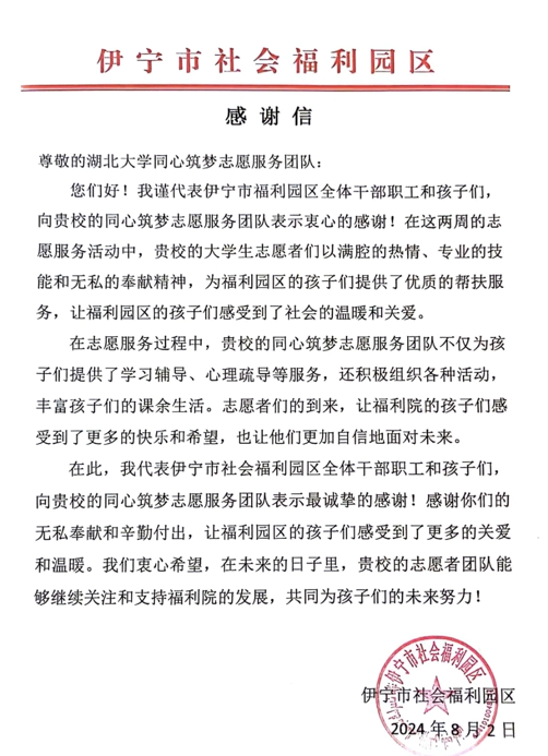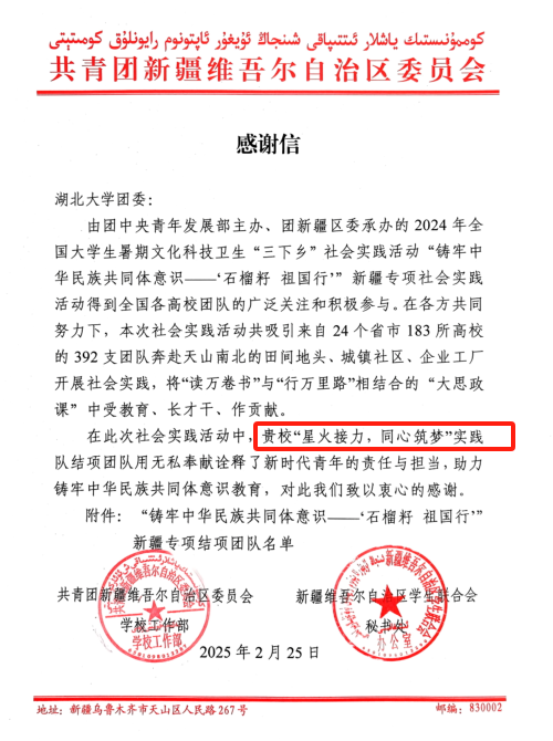 (通讯员 傅徐)日前,共青团新疆维吾尔自治区委员会学校工作部和新疆维吾尔自治区学生联合会秘书处向麻豆做爱 团委致感谢信,对麻豆做爱“星火接力,同心筑梦”实践团队在2024年全国大学生暑期文化科技卫生“三下乡”社会实践活动“铸牢中华民族共同体意识——‘石榴籽祖国行’”新疆专项社会实践活动对所作出的积极贡献予以感谢。