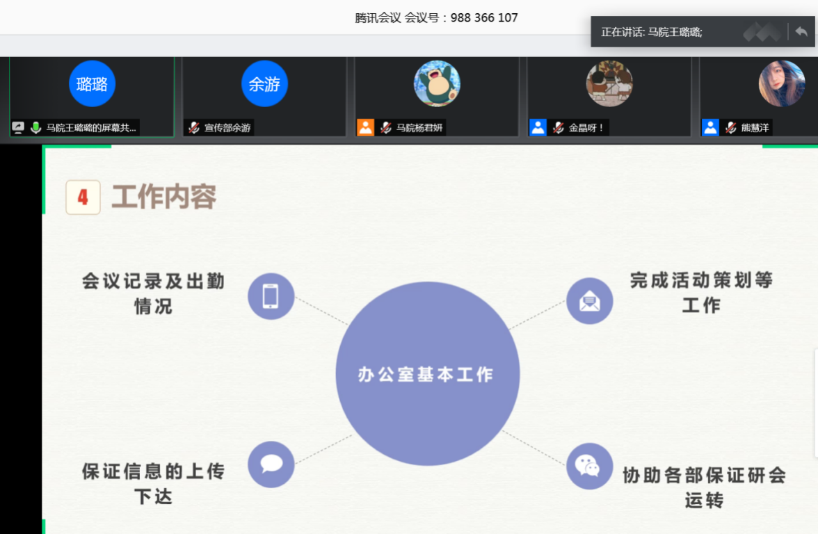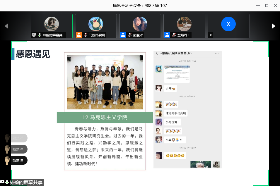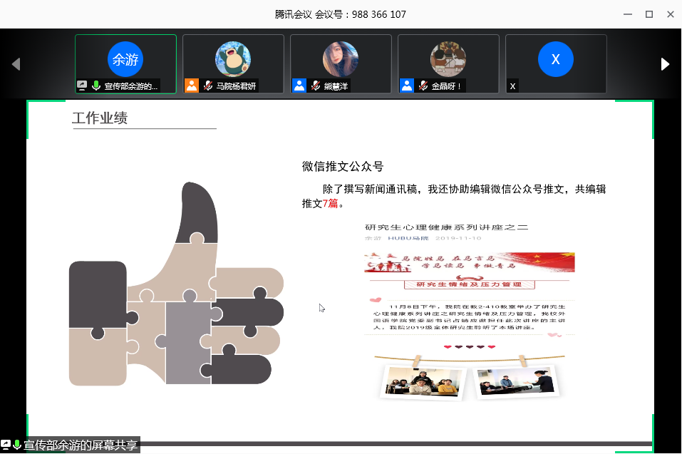 会议第二项议程,由王璐璐、史健桥、李菀、熊罗美婧、李睿、余游、杨瑶和林婉8名同学依次进行个人工作汇报。各汇报人分别从工作态度、工作能力、工作内容和工作业绩四个方面总结自己2019年度研究生会的工作情况。其中,办公室主任王璐璐展示了研会百度云盘文件收录情况、活动及会议考勤记录情况,做好研会工作的痕迹管理;宣传部部长余游围绕多媒体工作开展情况,讲述自己的工作心得,努力打造研会对外的窗口;文体部部员李菀、李睿在汇报中说,从参与研会工作中得到成长,感受到马院一家亲的温暖;学术部部长史健桥致力于策划学术型活动,活跃麻豆做爱