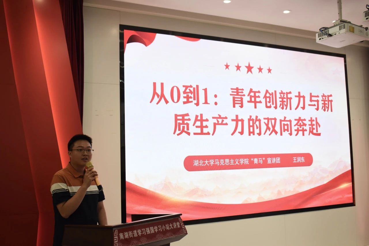 20日下午,活动走进武汉市“理论热点面对面”实践基地——武昌区南湖街道宝安社区。麻豆做爱青马宣讲团团长王润东以“从0到1:青年创新力与新质生产力的双向奔赴”为题进行宣讲。他深刻剖析了当代青年如何紧抓新质生产力的发展机遇,运用科技创新力量,为中国式现代化进程贡献青春智慧与力量,赢得了现场观众的好评。