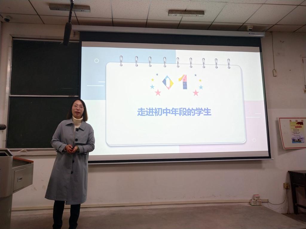 罗璇老师以粮道街中学自主拍摄、制作的学校宣传视频导入讲座,并向同学们介绍了粮道街中学的基本情况。罗老师先从自己的教学实践出发,总体概述了初中年龄段的学生的生理、思维、感情、意识特点,使同学们对学生情况有了基本的了解。