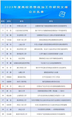 周芳教授和任怡博士合著的《中国共产党百年青少年思想道德教育研究》入选2023年度高校思想政治工作研究文库。此次入选全国共20项,湖北地区仅此1项。