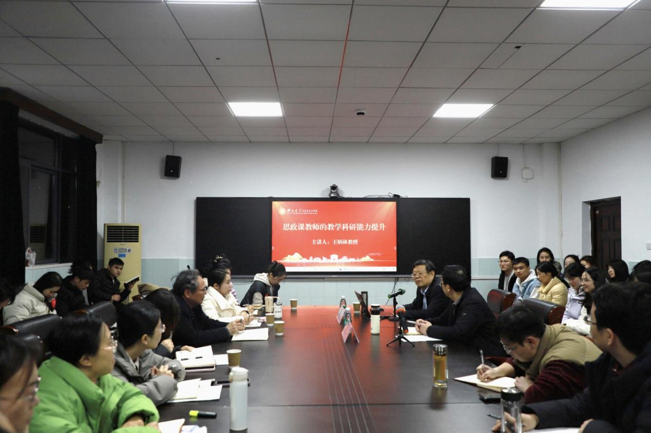 王炳林教授围绕教学改革、教学方法优化与科研能力提升三大核心方面,展开了系统且深刻的座谈分享。他围绕教学改革与教学科研能力提升提出系统性理念:在教学改革方面,坚守“变与不变”的辩证逻辑,核心是始终以马克思主义理论、党史和思想品德法治教育为主课程体系,同时试点新增“中共历史与理论”等课程以注入新活力;教学实践上凝练“作研究、抓重点、讲故事”九字要诀,强调教师需深耕教学内容、转化教材为教学体系,并以生动叙事提升育人效果;科研方面主张紧扣时代选课题,注重申报书撰写与学术梳理,并针对目标刊物进行成果传播,全面提升教学与研究质量。