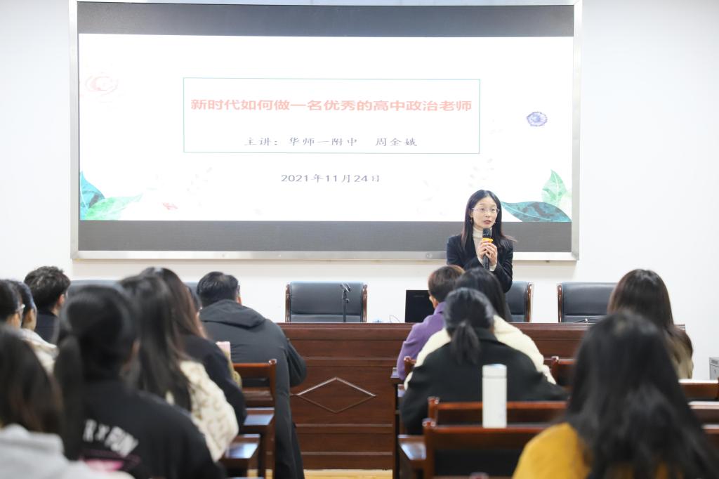 周金娥老师从“什么是优秀高中老师”、“什么是优秀高中政治老师”、“新时代对高中思政课教学的新要求”、“新时代如何成为一名优秀高中政治老师”四个方面展开本次讲座。她以扫码填问卷的方式与在场学生进行互动,了解大家对“一名好老师”的看法,并结合自己在华师一附中教学一线,提前收集的回答进行分享。在介绍完一线思政课教师面临的挑战后,周老师对在场同学提出忠告,她表示,一名优秀的高中政治老师需要有坚定的政治方向、与时俱进的学习能力、语言的趣味性和思维的逻辑性,要不断学习充实自己,把教育当作责任担当,培养德智体美劳全面发展的学生。
