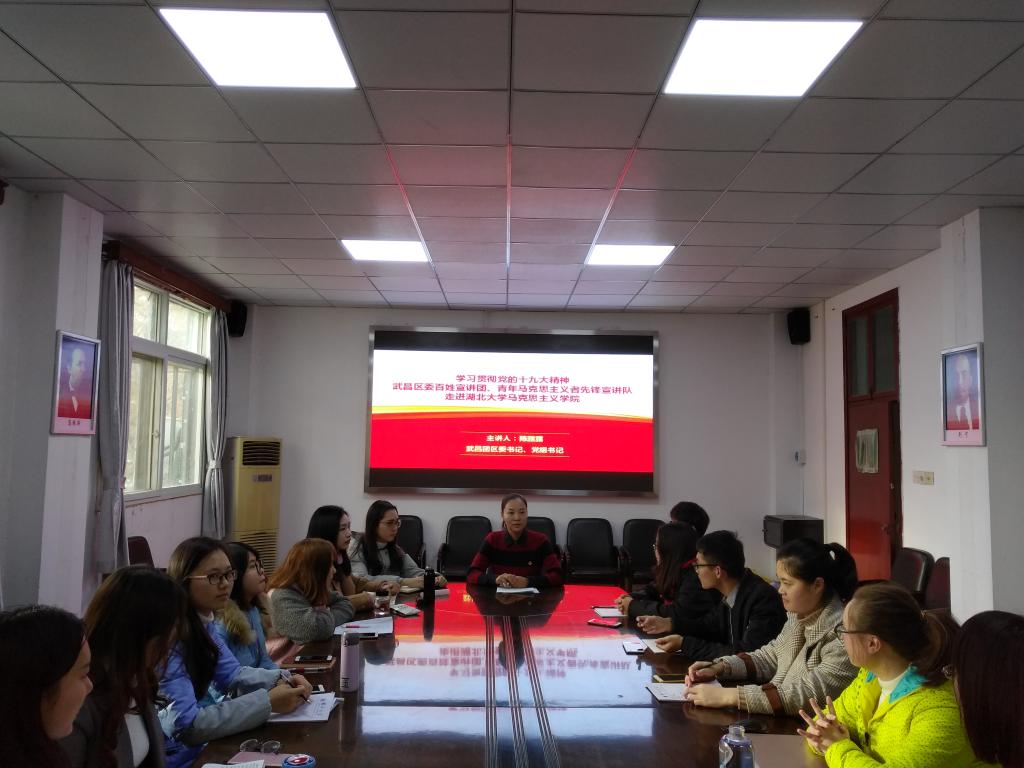 本次报告紧紧围绕十九大展开,分别从深刻领会中国特色社会主义进入新时代、准确把握新时代青年担当以及争当全面发展的时代先锋三个方面阐释了青年马克思主义者应该有什么样的担当、如何担当的重要问题。首先,陈书记带领同学们回顾了十九大重要内容和意义,从四句评价、三大成果、三大改观以及四大里程碑这四个方面有序凝练了十九大的深刻内涵和划时代意义。接着,陈书记阐释了“新变革”、“新矛盾”以及“新征程”三个新时代的特征,与同学们分享了如何深刻领会中国特色社会主义进入新时代这一重要命题。再次,陈书记从历史进程中的青年担当和习近平总书记寄语青年两个方面阐述了如何准确把握新时代青年担当。陈书记指出,“五四”时期以来,中国青年勇于担当自己的时代责任,积极传播马克思主义并投身于解放和建设中国的伟大实践。进入新时代,青年的使命就是要积极投身于建设富强、文明、和谐、美丽的中国的伟大实践,自觉地成为勇于担当的马克思主义者,为实现中华民族伟大复兴接力奋斗。最后,陈书记从新时代的坚定者、奋进者和搏击者三个方面论述了如何争当全面发展的时代先锋。她寄语在座青年学子,要坚定不移地以习近平新时代中国特色社会主义思想为指导,胸怀理想,自觉把个人理想追求融入国家和民族的事业中,深耕笃学、苦练本领,永不懈怠、开拓创新,以“功成不必在我,功成必定有我”的积极心态投身于新时代中国特色社会主义伟大实践。