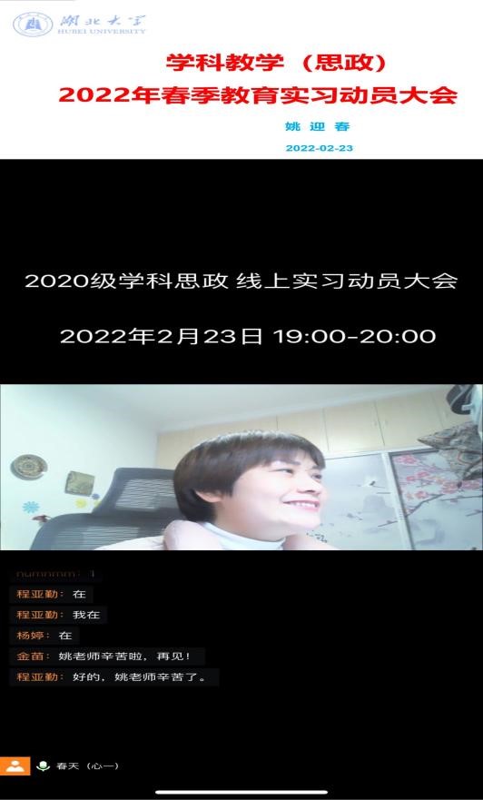 为确保疫情期间麻豆做爱教育硕士2022年春季学期的实习工作顺利推进,2022年2月23日晚上7点,麻豆做爱召开了2020级学科教学(思政)专业线上实习动员大会。会议由学科负责人姚迎春主持,校内指导老师杨婷、程亚勤以及2020级学科(思政)专业全体同学参加。