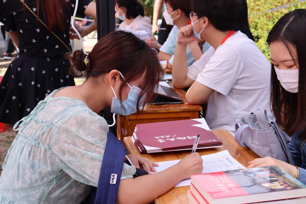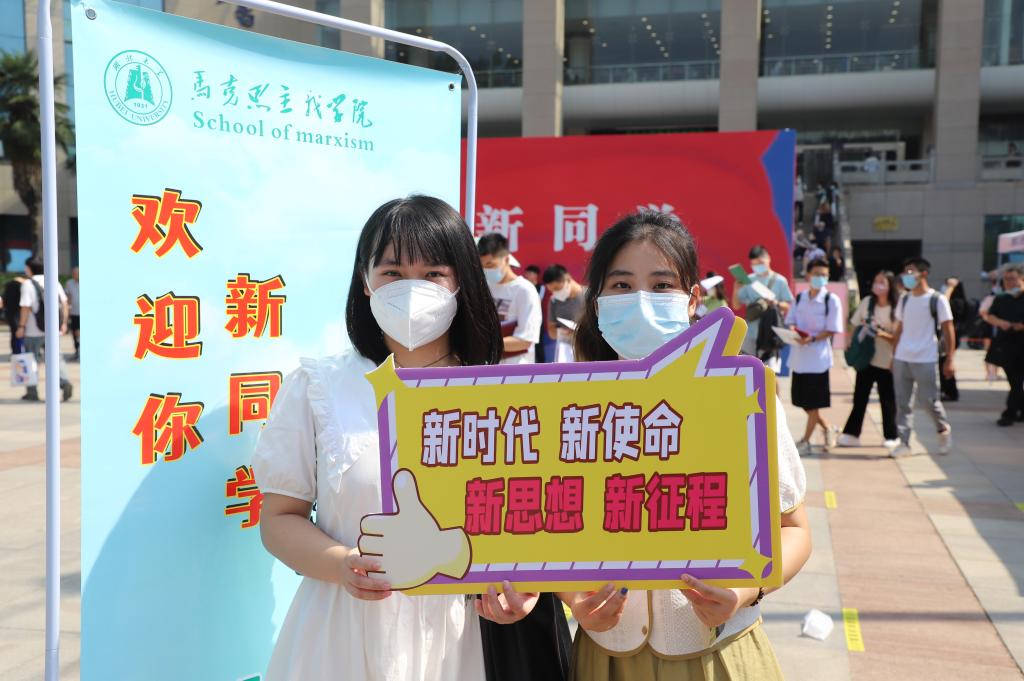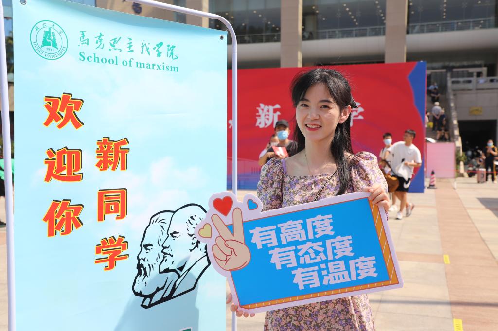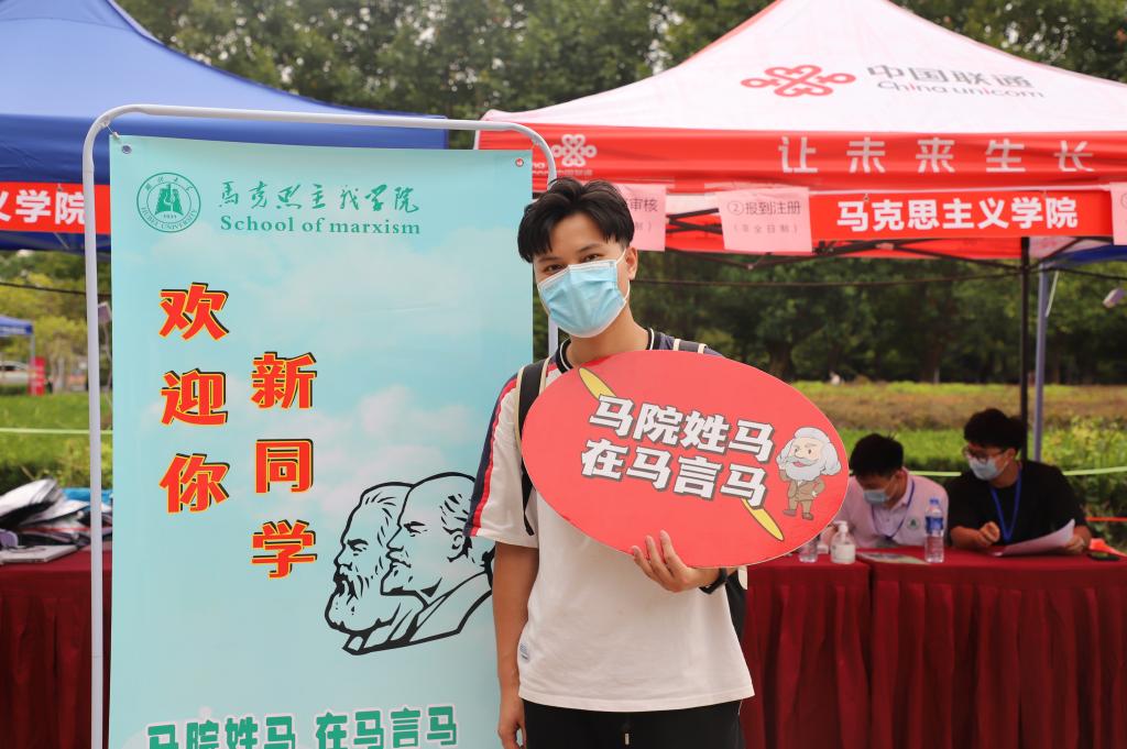 在帐篷旁设置打卡处,新生手持“马院姓马,在马言马”、“有高度、有态度、有温度”、“新时代新使命、新思想新征程”等手持牌拍照留念,留下初到湖大时的美好瞬间。新生们按照流程完成报到手续后,在志愿者的帮助引导下前往宿舍办理入住手续。
