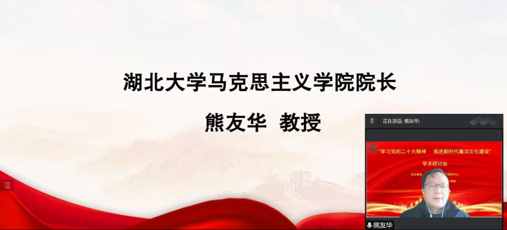 院长熊友华教授对专家报告作了总结点评。他表示,此次大会既是学术研讨会,也是一场高规格的党的二十大精神宣讲会,既是经验性探索,也是一场精致性的学术盛会。各位专家学者的分享主题聚焦、视角多样、观点新颖、学理性强,为深入推进新时代廉洁文化建设提供了理论支撑和智力支持。