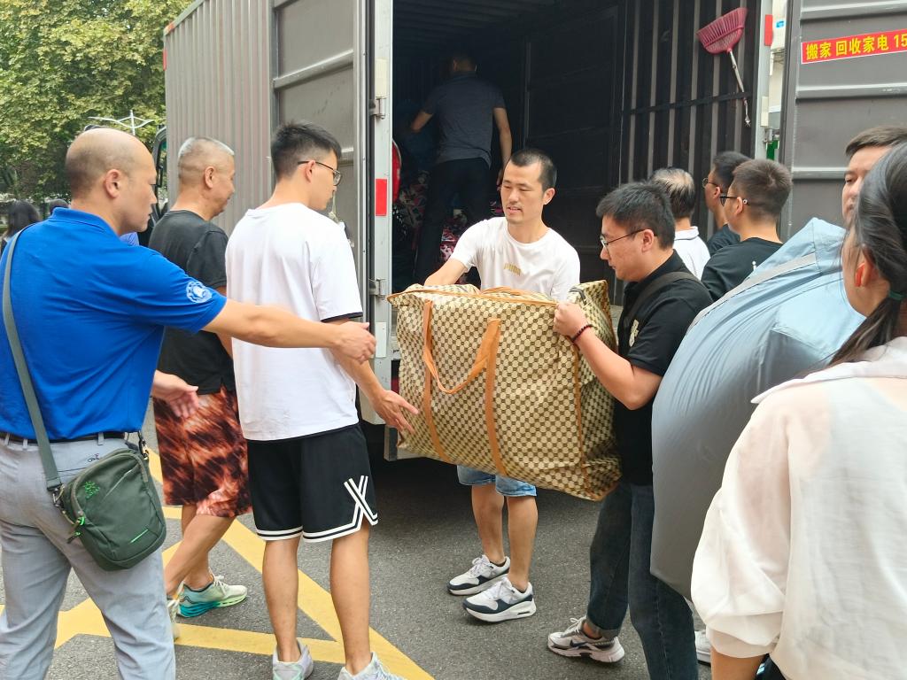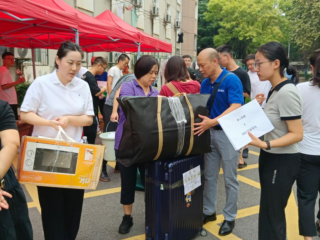 安排了志愿者看守现场行李,整个搬运过程分工明确、井井有条,十分有序。空气湿热,气温超过三十多度,参加搬迁工作的每一个人的衣服被汗水浸湿,但脚步从未停歇。从车上搬下行李、一层层爬楼搬运行李、快速跑下楼搬下一趟行李……大家都认真负责地将自己的任务落实到位,毫无怨言。
