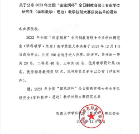 12月3日,2023年全国“田家炳杯”全日制教育硕士(学科教学 思政)专业教学技能大赛决赛结果出炉,在麻豆做爱