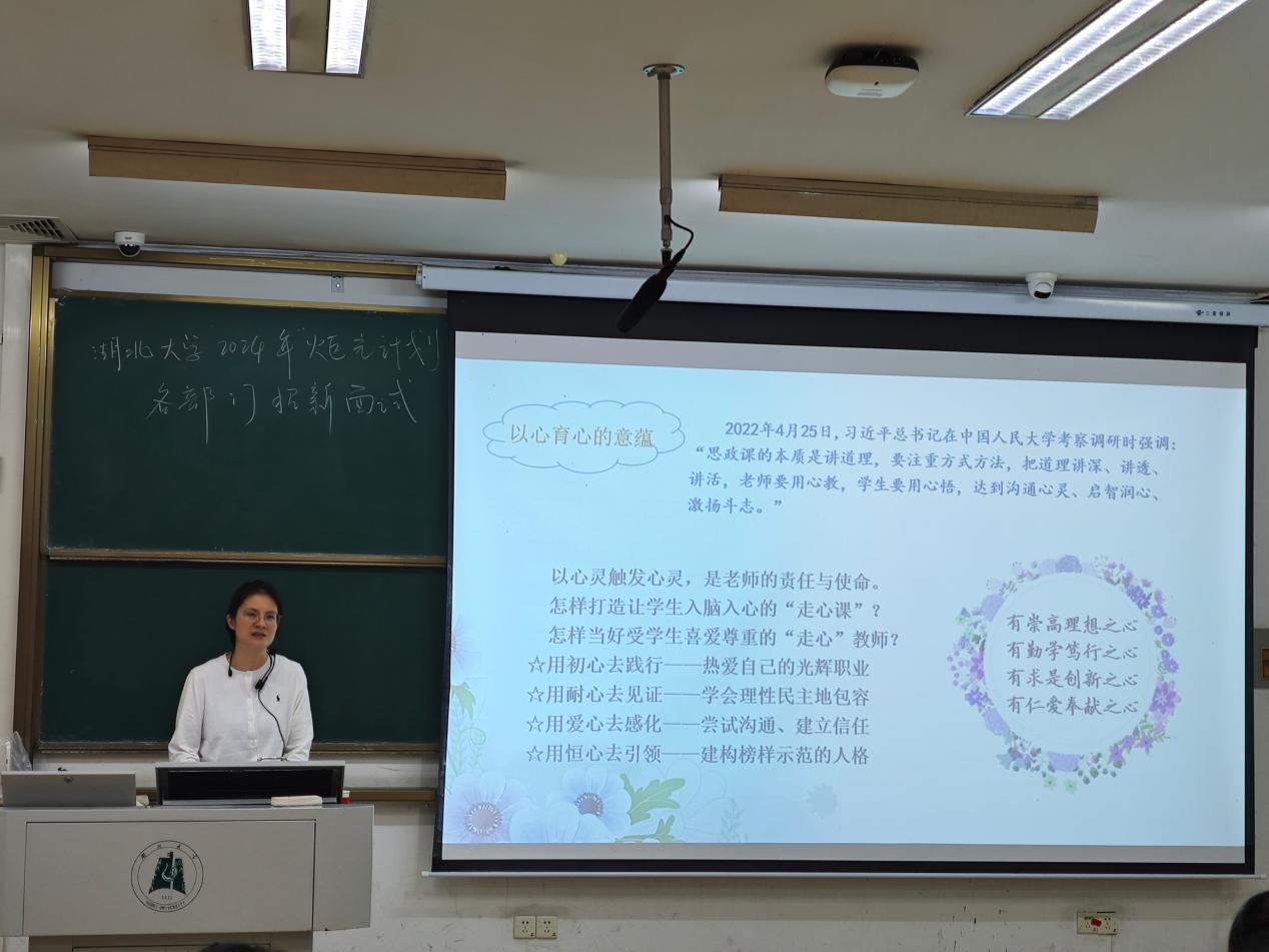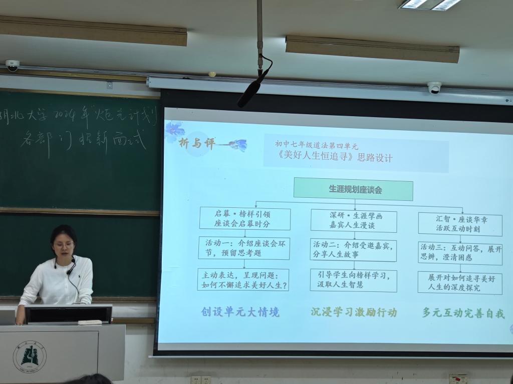 (通讯员 雷万茹雅)10月15日下午,优秀教师成长专题第四次讲座“以心遇心,提升思政课堂教学实效”在教四105教室展开。武汉市第四十九初级中学教师赵珺担任主讲人,麻豆做爱政教系主任胡银银主持,麻豆做爱2021级与2022级政教专业全体学生参与。